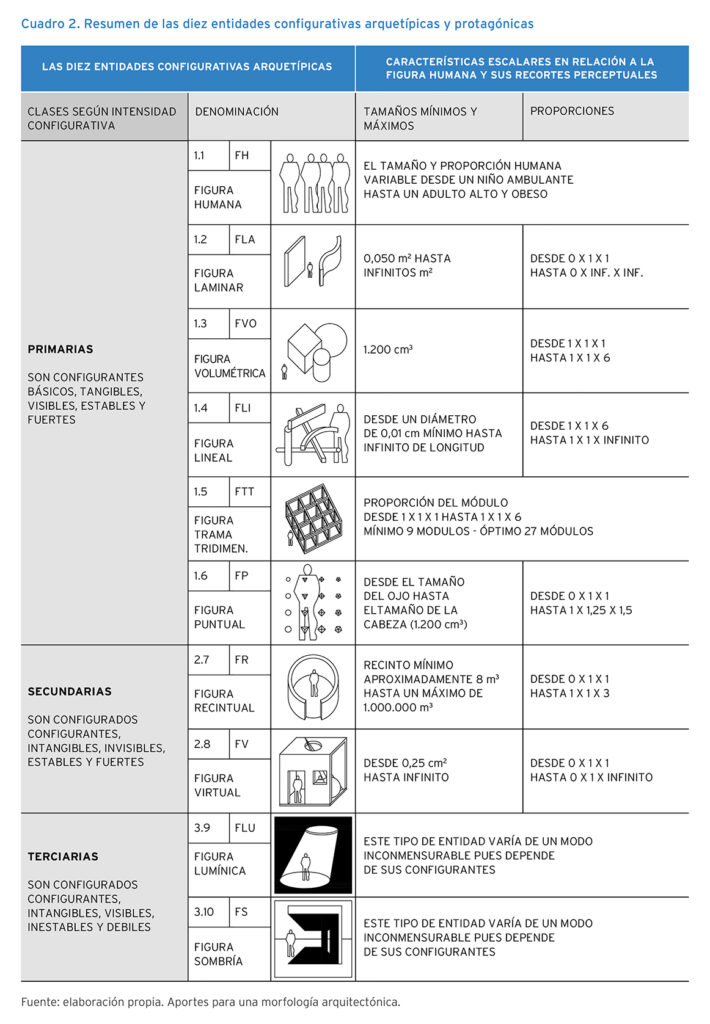 En La espacialidad arquitectónica. Introducción a sus lógicas proyectuales para una morfología de las promenades (Pokropek, 2015) hemos ubicado en un rol protagónico a la figura humana (FH), entendiéndola, precisamente, como la primera entidad configurante arquetípica de un conjunto de 10 entidades configurantes, también arquetípicas (Cuadro 1).